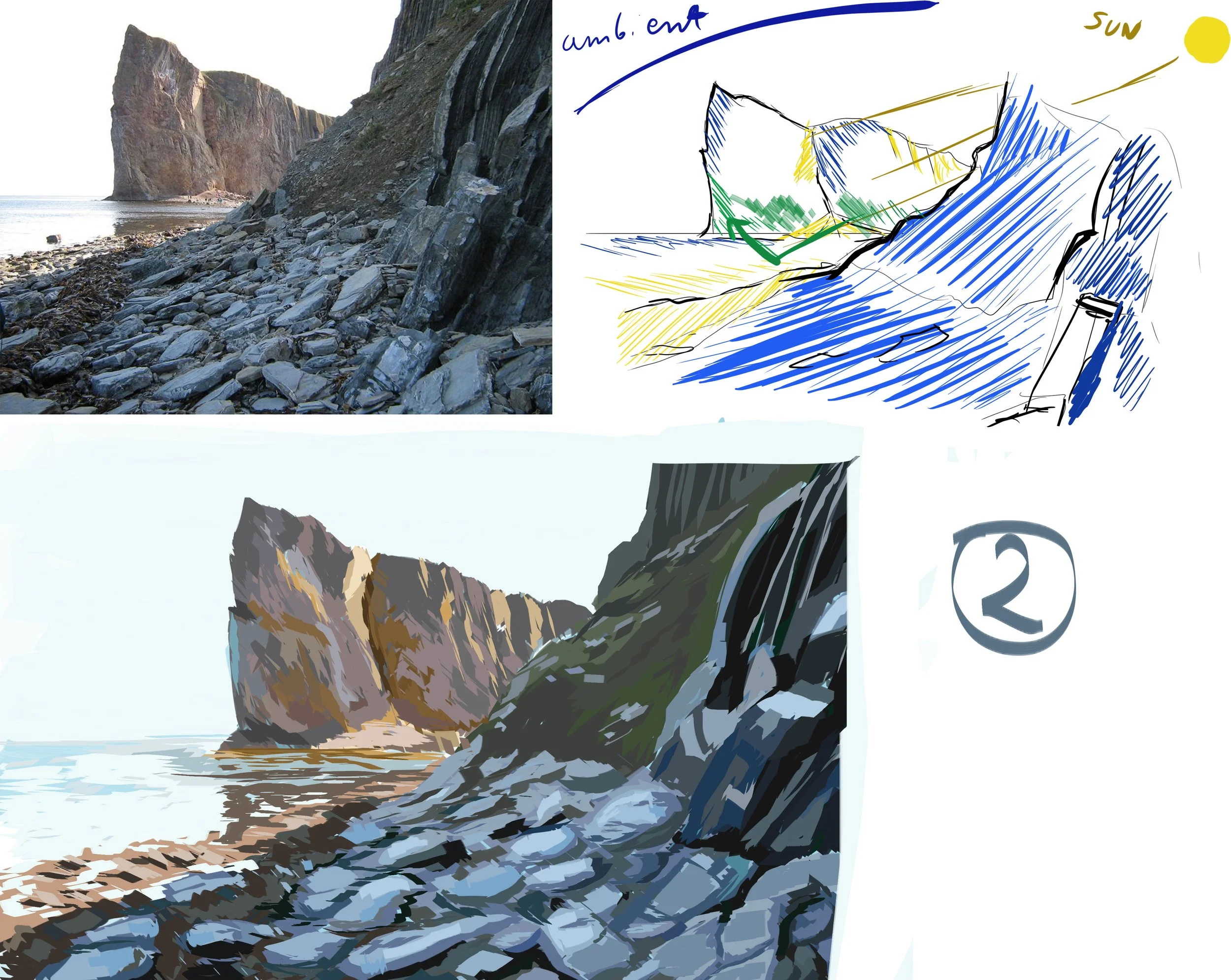 Week 5 - introduction to painting samples of landscapes. Understanding logically how to depict materials and shapes in your scene. Extensive studies from landscape reference. Gaining the ability to understand our reference material by understanding what we paint and not only what we see.
